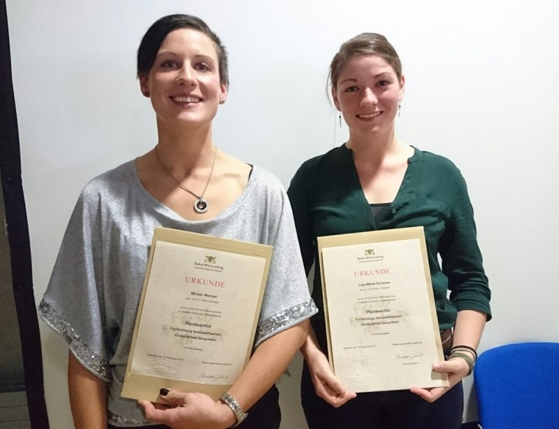 Anlässlich des German Masters Turnieres in der Stuttgarter Schleyer-Halle konnten unsere beiden Auszubildenden Miriam Wenzel und Lisa-Marie Schwarz sowie ihre zahlreichen Pferdewirt-Jahrgangskollegen am vergangenen Freitag ihre Urkunden von den Vertretern des Regierungspräsidiums Karlsruhe in Empfang nehmen. Mimi und Lisa haben nach zweijähriger Ausbildungszeit Ende Juni erfolgreich ihre Prüfung zum Pferdewirt Schwerpunkt Spezialreitweisen Gangreiten abgelegt.