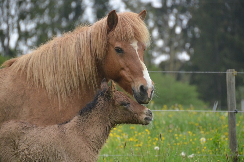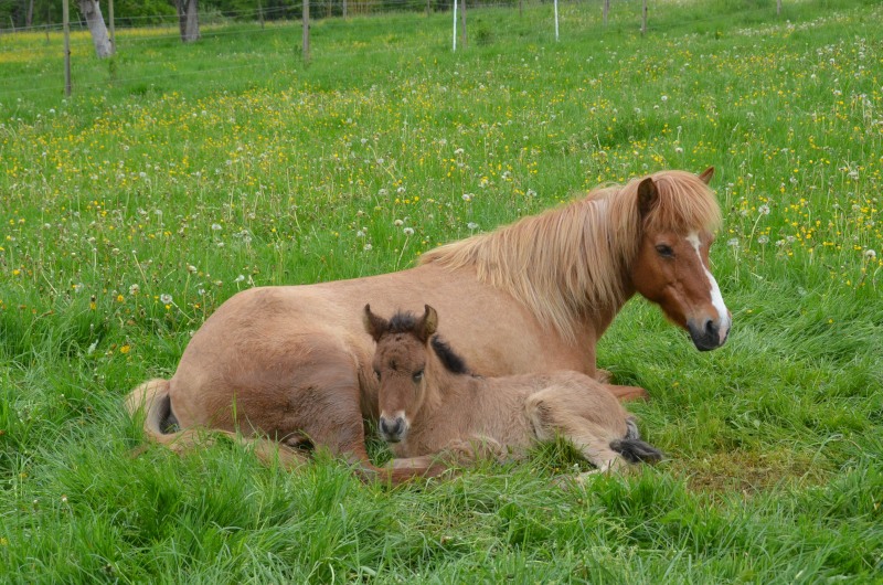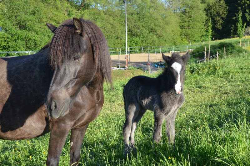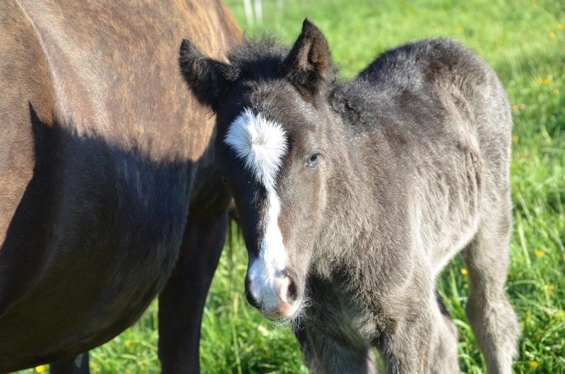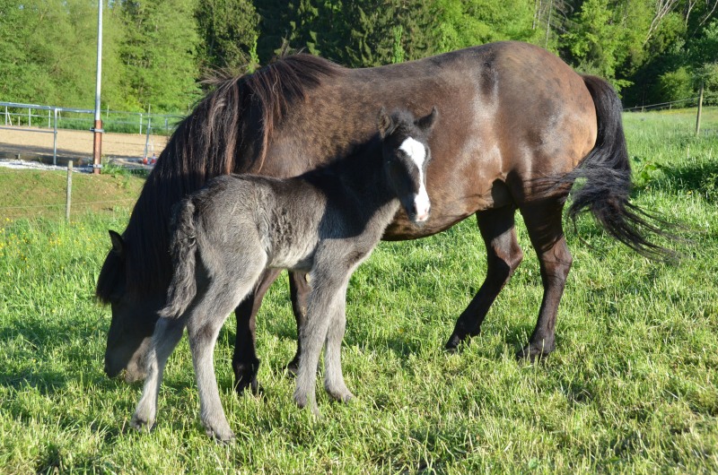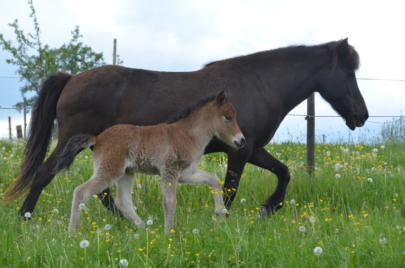 Ein weiteres sehr hübsches Sprengi-Hvellur-Fohlen ist der Braune Rasmus aus der Elitestute Runa. In der Nacht auf Pfingstsonntag kam der große bildschöne Rappe mit Blesse Viktor aus unserer Ladina und dem Elitehengst Valgard zur Welt.