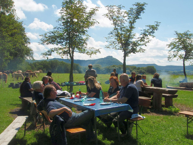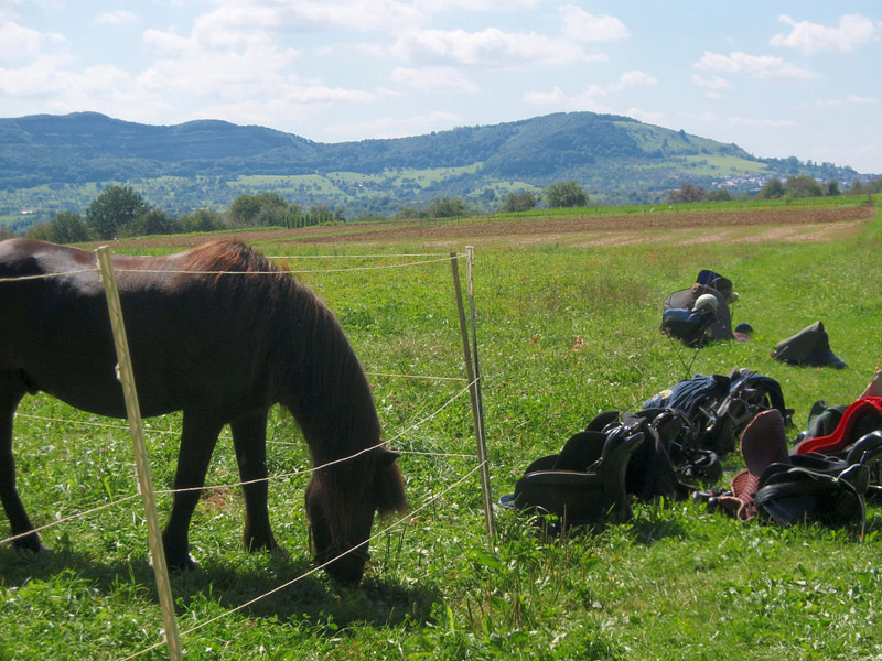 Die Mittagspause genossen Zwei- und Vierbeiner bei herrlichem Blick über den Albtrauf mit Hohenneuffen, Hörnle und Jusi. Doch irgendwann mußten auch wir wieder aufbrechen. Nachdem alles wieder ordentlich eingepackt war, gings auf dem Nachhause-Ritt noch eine flotte Runde durch den Wald und ein Stück entlang des Obstlehrpfades von Frickenhausen, der dieses Jahr sein 10-jähriges Bestehen feiert.
