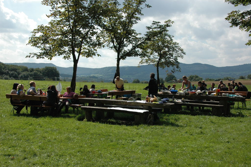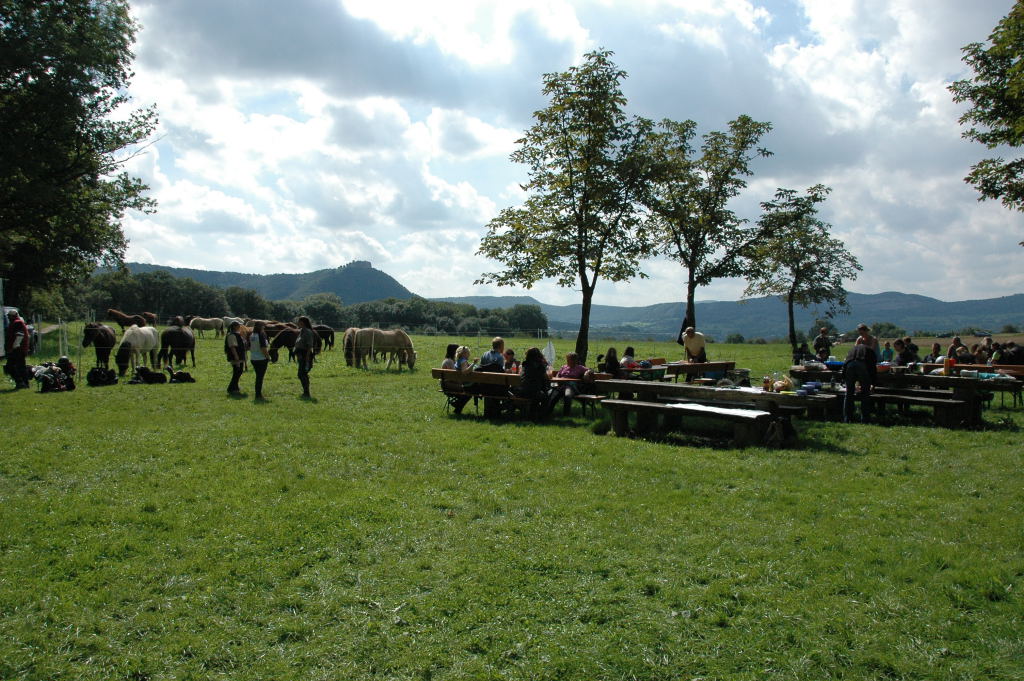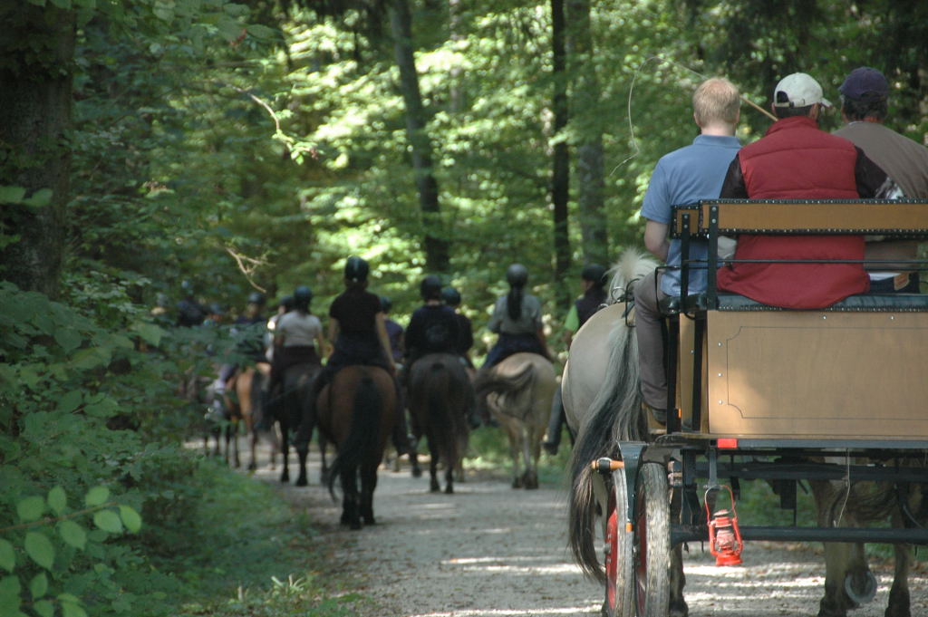 Mit 20 Pferden unterwegs, 2 davon vor der Kutsche , gings wieder durch Wiesen und Wälder zum Linsenhofer Trauf. An der Feuerstelle konnten wir und unsere Pferde eine gemütliche Pause einlegen. Anschließend gings in einer flotten Runde bis ins Tiefenbachtal runter und dann nach Hause.