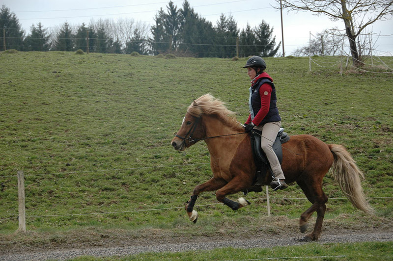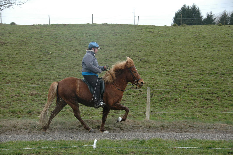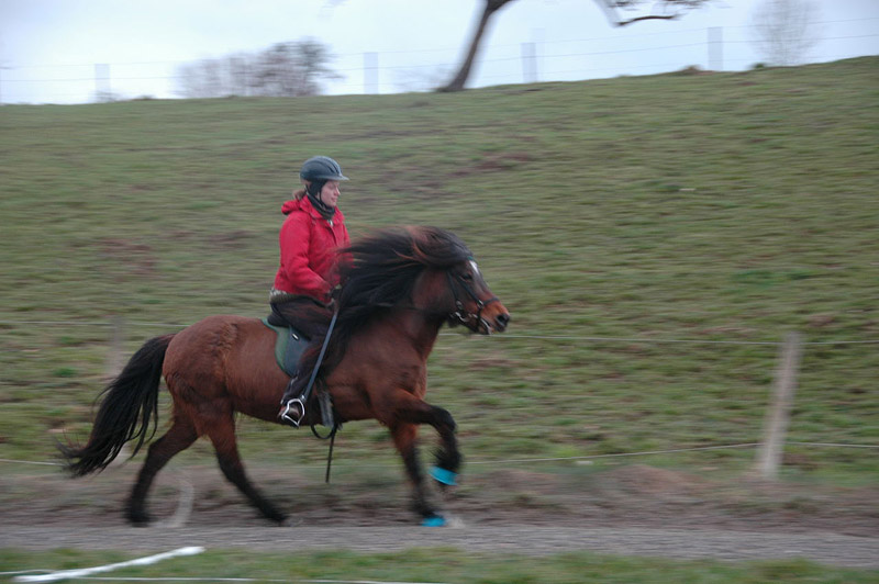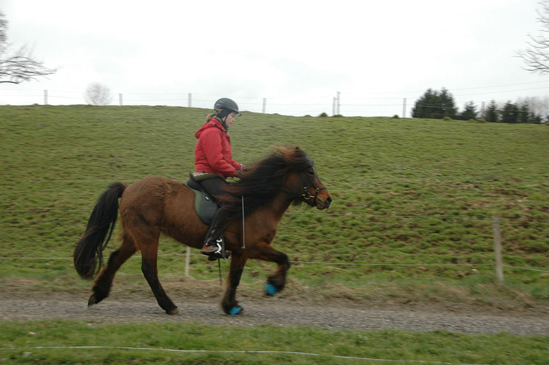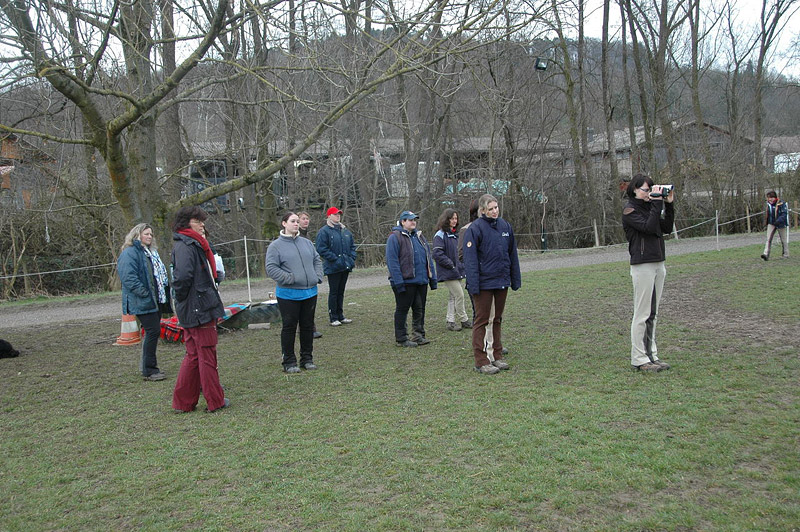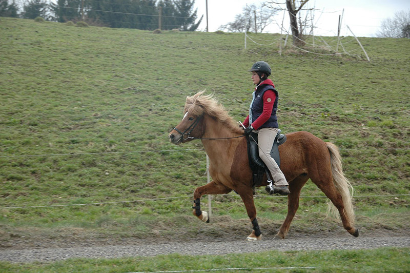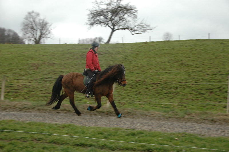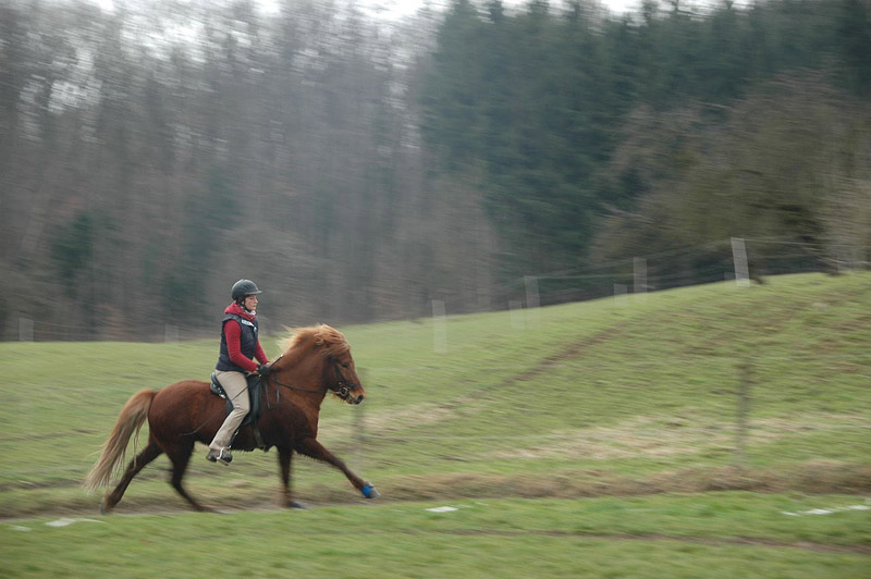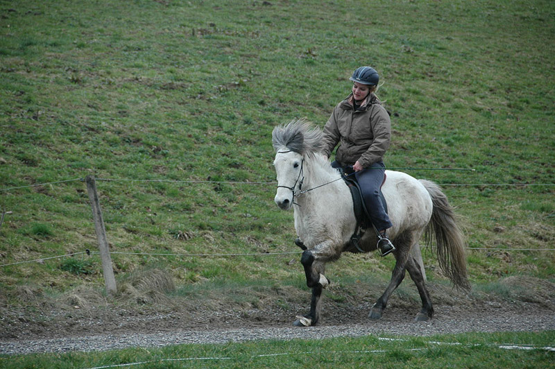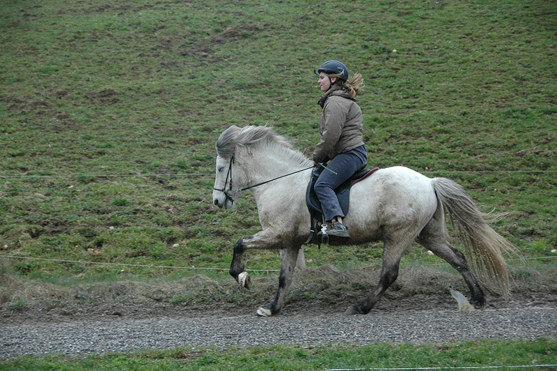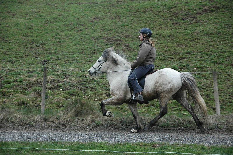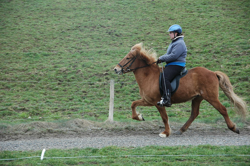 Nach der Theorie ging´s raus auf die Ovalbahn. Wir hatten zwar kaltes Wetter, aber immerhin bescherte uns der Wettergott heute trockenes Wetter, später kam ja sogar noch die Sonne heraus. Wir bekamen von unseren Reitern verschiedene Tölt-, 4-Gang-, und sogar eine 5- Gangprüfung zu sehen, die wir anhand Caros Leitgedanken gemeinsam bewerteten. Klar wurde natürlich viel gefragt und diskutiert, aber so konnte man das Richtsystem eben auch verstehen lernen.