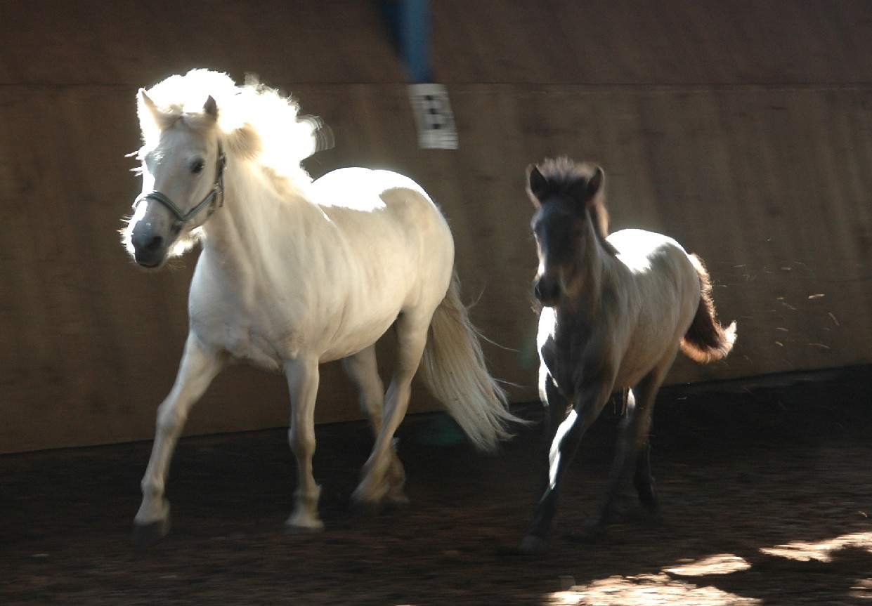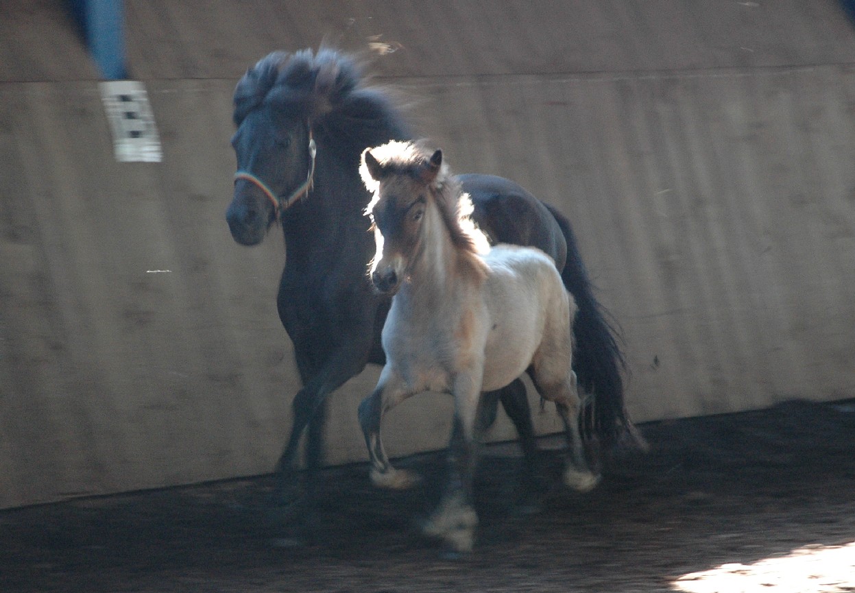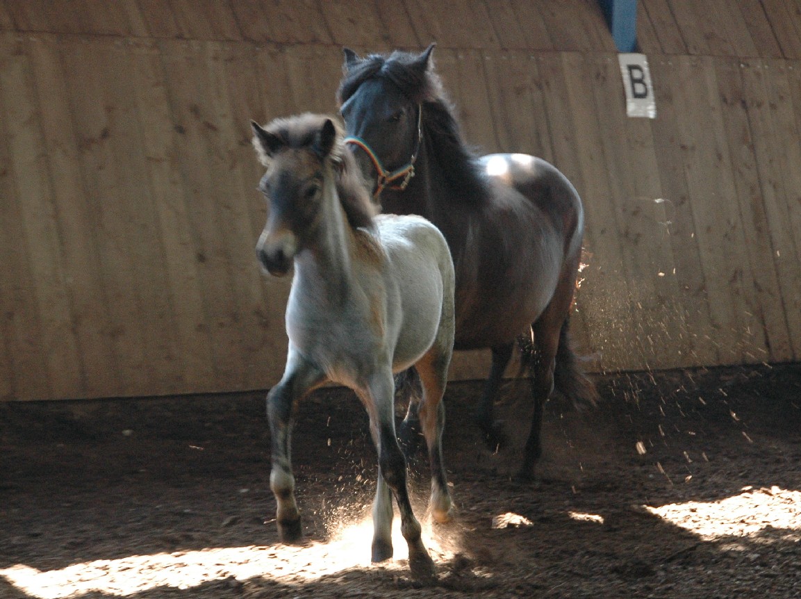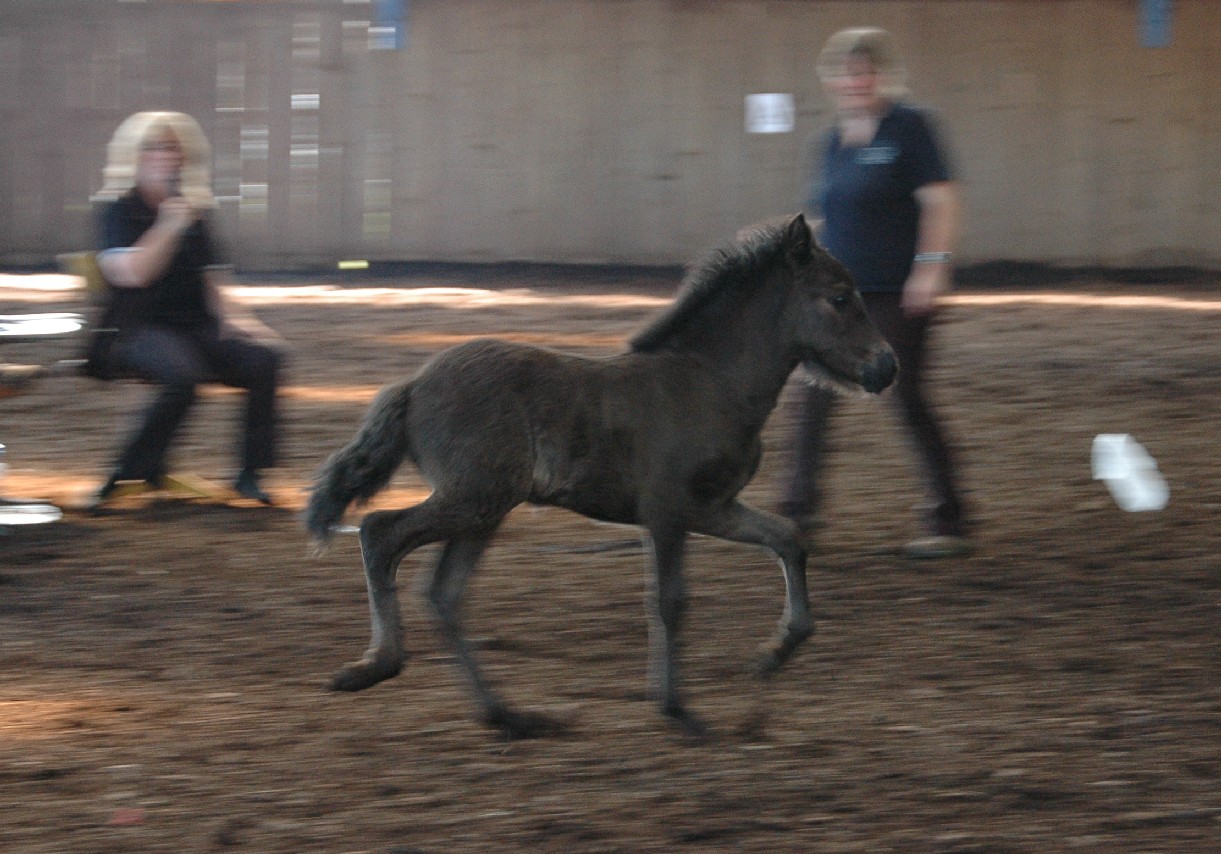 Die Yngri-Fohlen konnten auch in der Bewegung gut gefallen.  Unser Braunfarbwechsler-Fohlen Sprengi-Hvellur bekam für den Gang die 8,30, der Fuchsfalbe Ullin erhielt für Gang die 8,20 und der Kátinasohn die 8,0. Bestes Hengstfohlen war mit einer Gesamtwertung von 8,05 der Fuchsfalbe-Farbwechsler Yggdrasill von Yngri aus unserer Perla. Bestes Stutfohlen mit 8,10 in allem war die erst 4 Wochen alte Lyfting- Tochter Lexia, die  Throttur frá Hvalsnesi zum Vater hat.